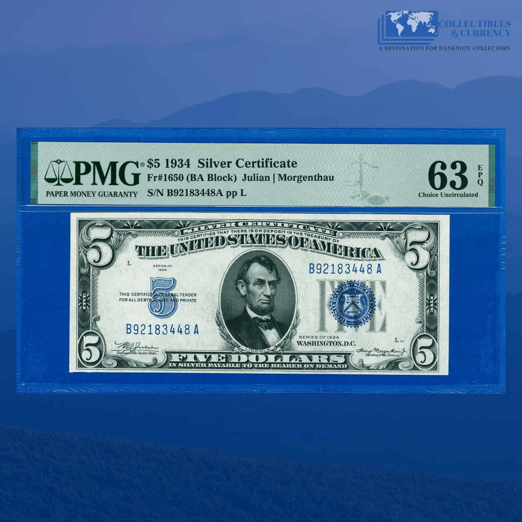 Fr.1650 1934 $5 Five Dollars Silver Certificate, B/A Block, PMG 63 EPQ