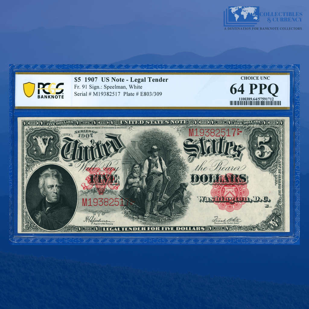 Fr.91 1907 $5 Five Dollars "WOODCHOPPER" Legal Tender Note, PCGS 64 PPQ
